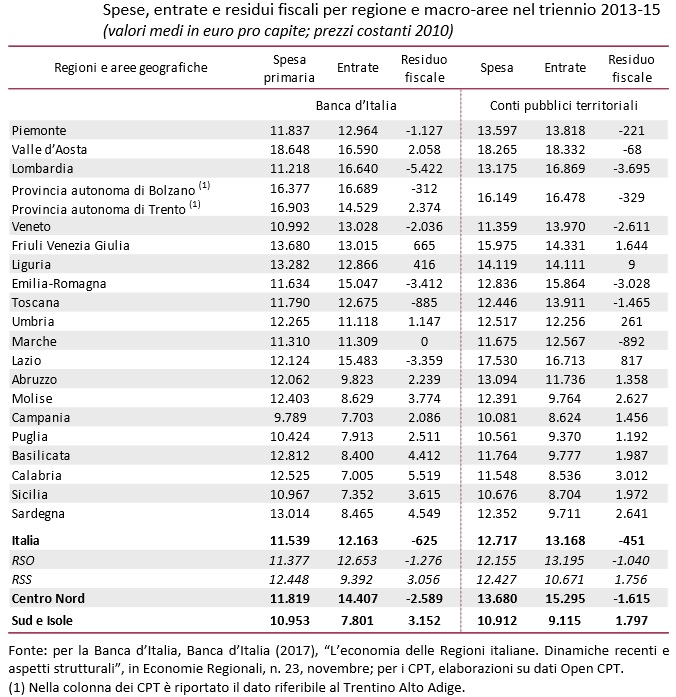 Dai dati risulta confermato che le entrate pro capite regionali sono all’incirca proporzionali al PIL pro capite regionale (sono maggiori nelle aree più ricche), mentre la distribuzione delle spese regionali è assai più uniforme rispetto al variare del reddito pro capite regionale. Ne consegue che le regioni con PIL più elevato mostrano residui negativi (entrate maggiori delle spese) mentre le regioni con PIL più bassi evidenziano residui positivi (spese maggiori delle entrate).