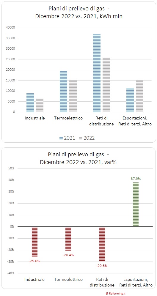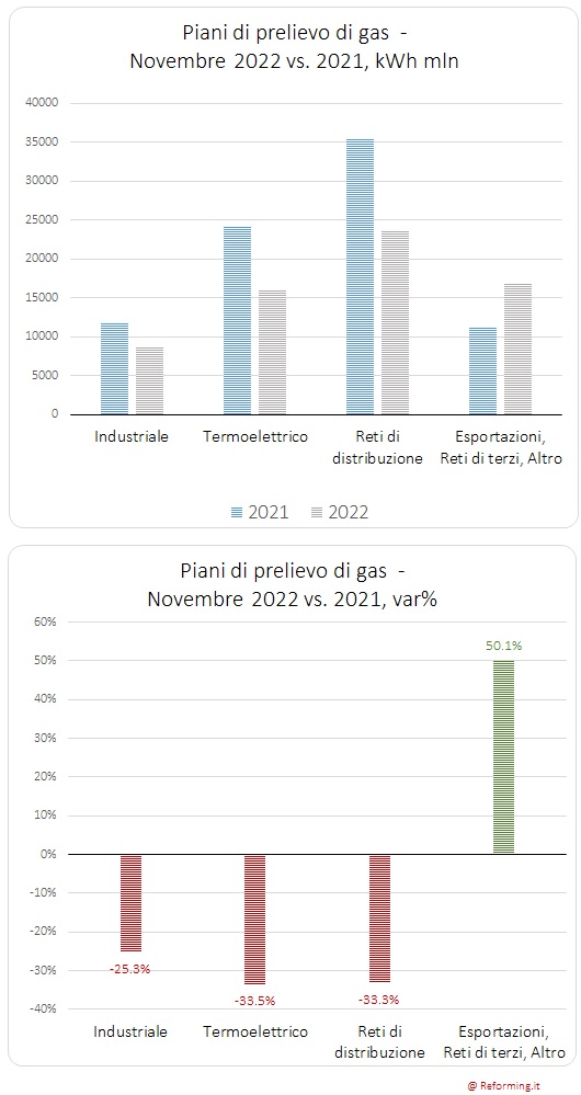 A novembre 2022, i piani di prelievo industriali hanno fatto segnare una riduzione tendenziale del 25,3 per cento, che diviene 25,6 per cento se si considera il mese di dicembre (sino al 22-esimo giorno del mese).