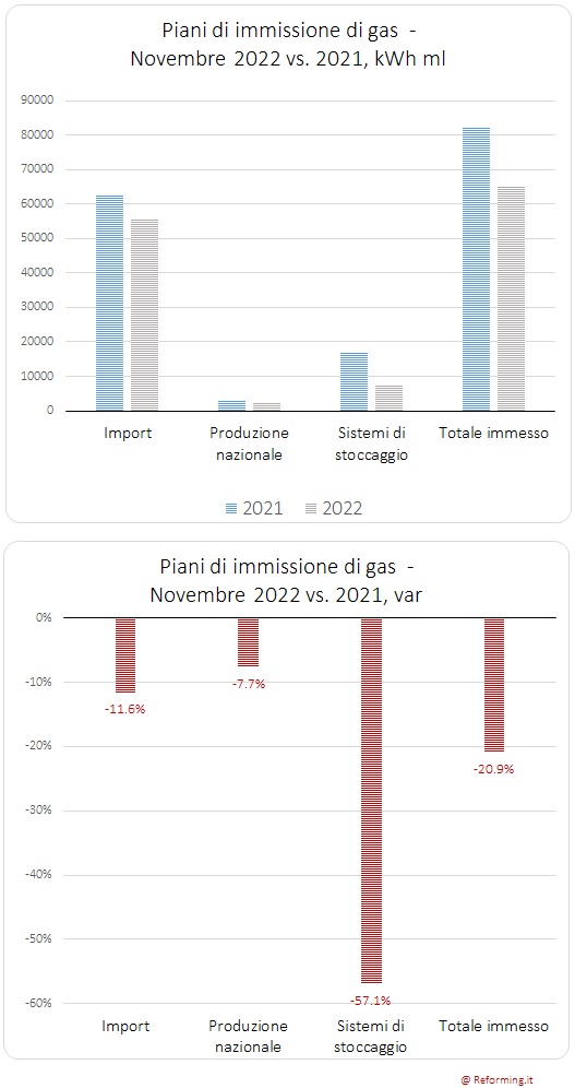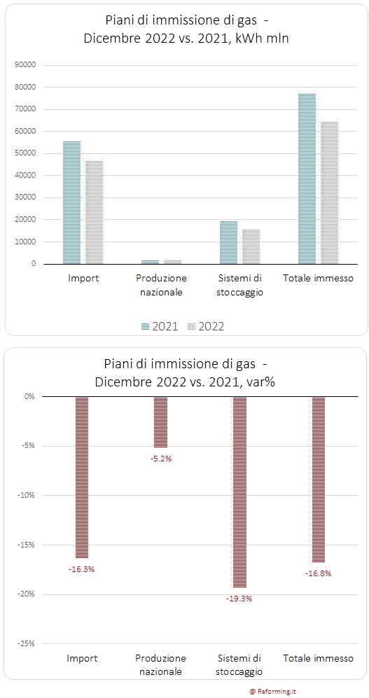 A dicembre 2021 e 2022, oltre il 72 per cento delle immissioni in rete proviene dall'import. A novembre, invece la quota import è più elevata e pari a oltre il 75 per cento nel 2021 e a circa l'85 per cento nel 2022. Il maggior ricorso all'import a novembre 2022 si spiega, con ogni probabilità, con il completamento delle scorte stoccate sino a saturazione dei depositi.