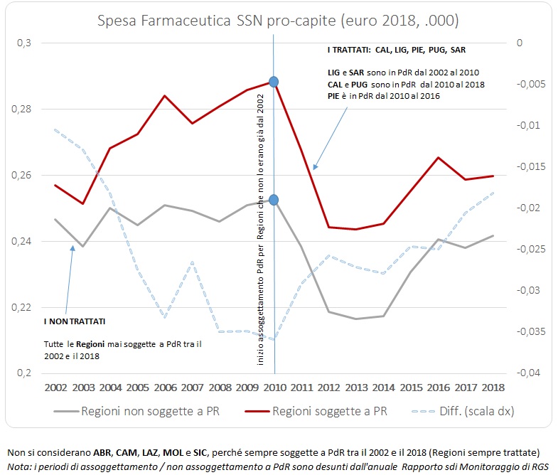 Sul fronte della farmaceutica, l’esercizio diff-in-diff porta evidenza a favore della tesi che, innestandosi sopra la tendenza comune a tutto il Paese di una ricomposizione della spesa farmaceutica dalla fascia “A” alla fascia “H”, le Regioni in PdR abbiano, più o meno consapevolmente, fatto maggiore affidamento su questa ricomposizione come via per alleviare le pressioni della spesa sui bilanci. Dopo qualche anno di "rodaggio" degli interventi, l'effetto netto sulla spesa di fascia "A" e di fascia "H" risulta negativo, cioè nel verso di una riduzione risultante da una significativa minore spesa in fascia "A" (ben al di là del trend negativo comune a tutto il Paese) e da una significativa maggiore spesa in fascia "H" (al di là del trend positivo comune a tutto il Paese).