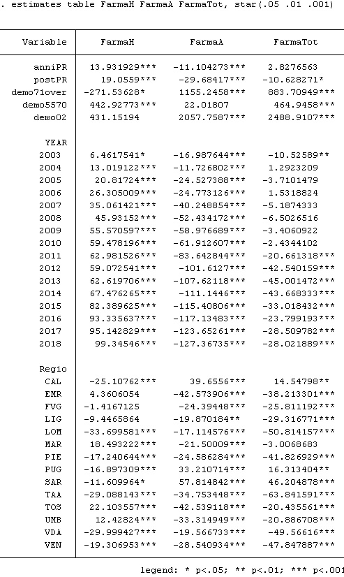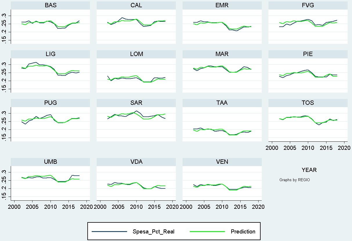 I risultati sono riassunti nel seguente output di Stata, che mette a raffronto le tre stime panel, Il successivo grafico si riferisce alla spesa farmaceutica pro-capite complessiva (in migliaia di Euro 2018) e mostra, per singola Regione, la serie storica, ricostruita dai conti CE, e la sua stima econometrica.